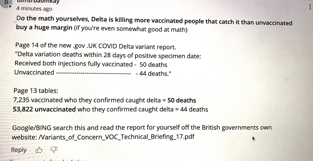Since I’ve come to expect the censorship, a sad and dangerous sign of the oppressive times we are living in, I quickly took a picture of the comment before it was deleted. I then did what I wished more people did: I looked up the information myself, including the link which takes you to the official page of the British Government’s public information on COVID. (https://assets.publishing.service.gov.uk/government/uploads/system/uploads/attachment_data/file/1001354/Variants_of_Concern_VOC_Technical_Briefing_17.pdf).