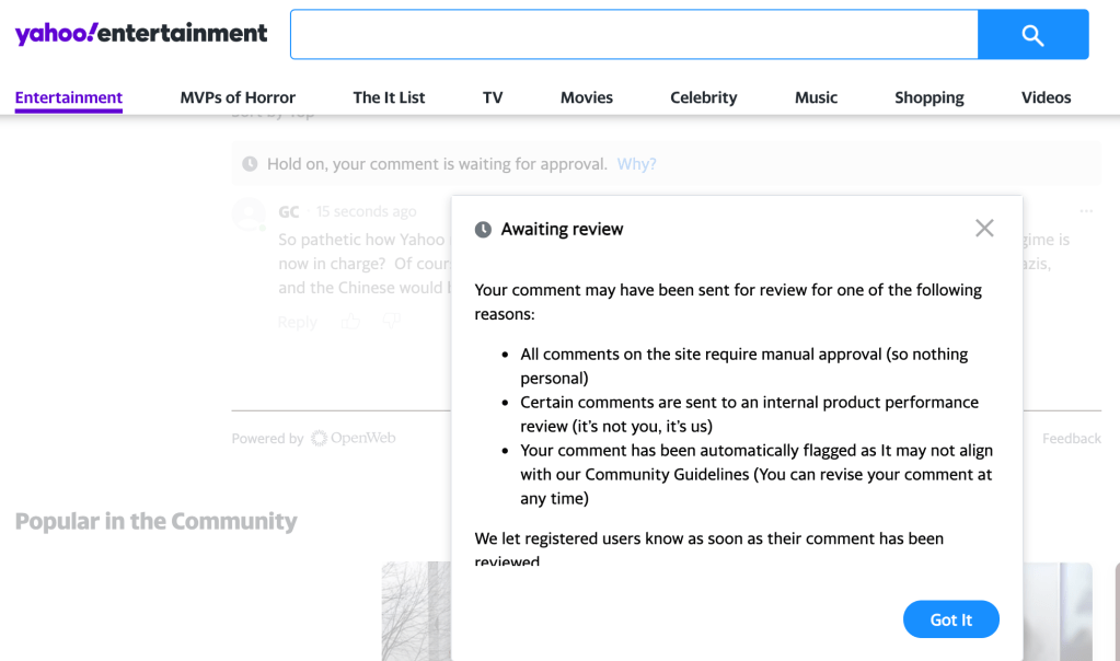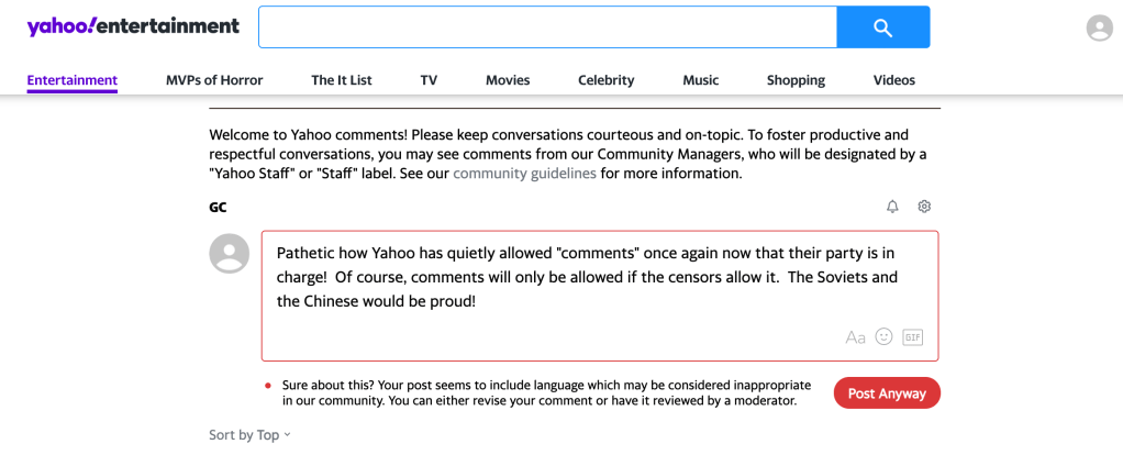 Yahoo, which got rid of the “Comments” sections in their stories over a year ago for fear that their readers could potentially learn some truth from other commenters, recently reintroduced the “Comments” section. Except that only comments that are approved by Yahoo censors will be allowed. For example: